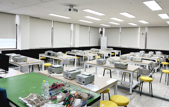 - 전기전자실험 1인 1실험 가능본 학과는 2학년 1~2학기에 수강하는 전기전자실습I 및 II 강의를 위한 특별한 실험 환경을 조성하고 있습니다. 그래서, 기존 4~5명씩 한팀으로 하는 실험이 아니라 학생 1인이 1실험을 가능하도록 하여 학생들의 실험실습 능력을 배양하고 있습니다.