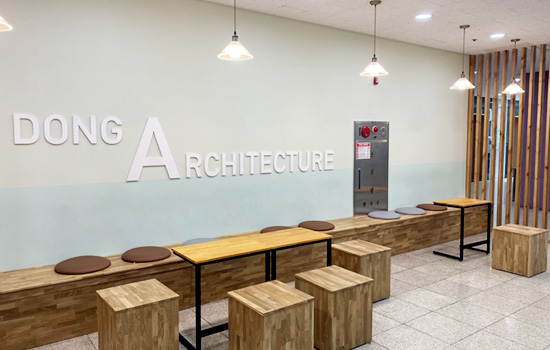 - 학생 쉼터강의실과 실습실 사이에 학생들의 쉼터를 조성하여 학생들이 서로 소통할 수 있는 공간을 만들어 쉬기도 하고, 함께 그룹 과제를 자유롭게 토의할 수 있는 곳을 만들었습니다.