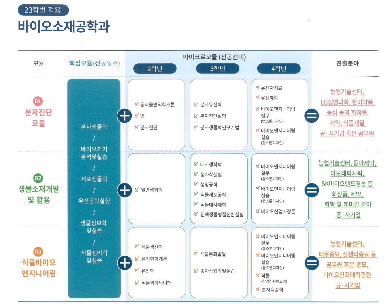 - 학과 마이크로모듈 구성 단편화된 일체형 전공교과목에서 벗어나 학문적/실용적 특성에 맞추어 체계화함으로써 바이오소재공학과에 공부하는 내용을 영역별로 명확하게 함